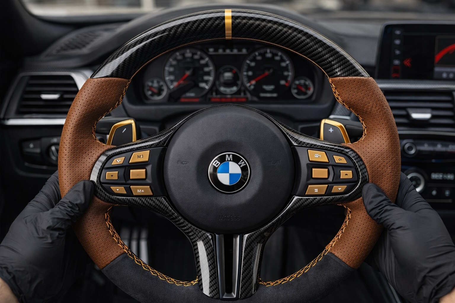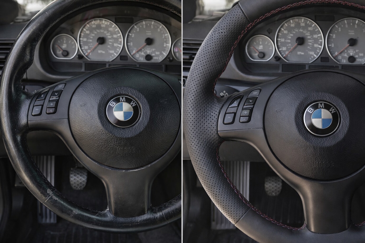 Перетяжка и декоративная строчка с выбором кожи, цвета нитей и фактуры. Это позволяет адаптировать руль под стиль салона и личные предпочтения водителя.